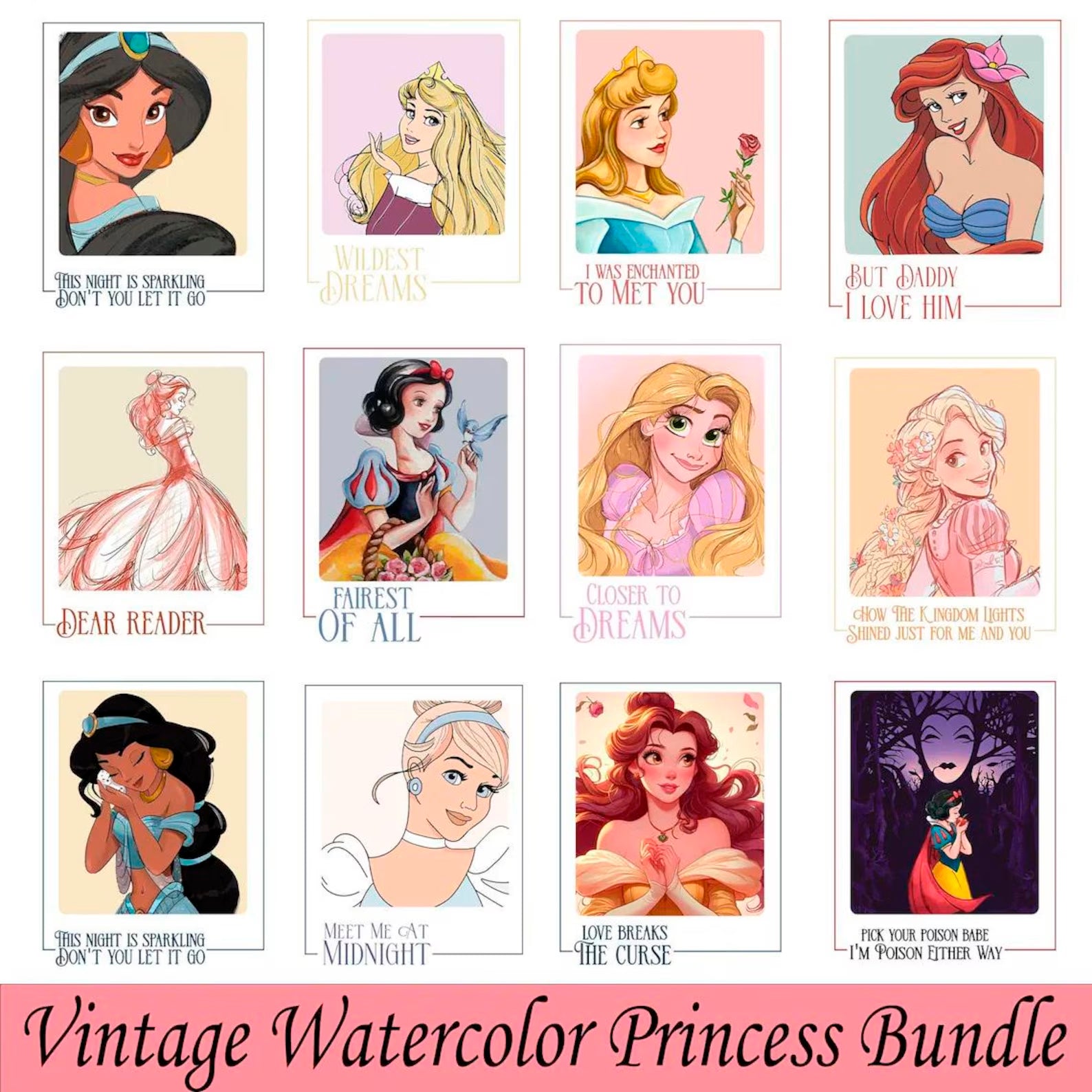 Disney Princess PNG Bundle with 200 files in SVG and PNG. Perfect for cutting, printing, sublimation, t-shirts, crafts, and birthday party decorations.